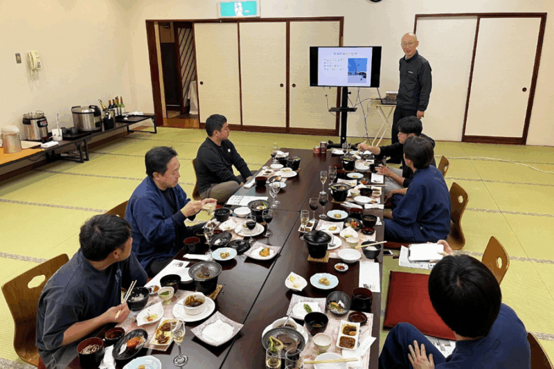 トムラウシ温泉東大雪荘にチェックインした後、ガイドも交えての夕食交流会があります。郷土の一皿を味わいながら、ガイドからトムラウシという土地の歩みや文化をやさしく解説していただきます。食卓を囲んでの団らんは会話も弾みます。