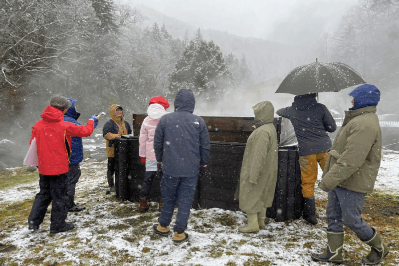 翌朝、東大雪荘の施設一帯を散策。トムラウシ温泉の泉質や湧出のしくみ、歴史とマナーを手軽に学ぶミニツアーです。