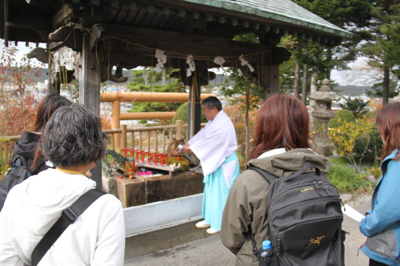 お抹茶をいただいたら、浦幌神社を参拝します。宮司から直接正式な参拝方法を学ぶ貴重な機会。日本人でもなかなかできない体験です。